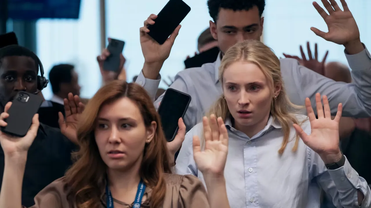 4. Sophie Turner vive sua personagem mais vulnerável. Conhecida por papéis fortes e contidos, Sophie surpreende como Zara, uma funcionária comum jogada em uma situação extrema. A atriz aposta em nervosismo, culpa e medo constantes, criando uma protagonista longe do estereótipo de 'heroína de thriller'.